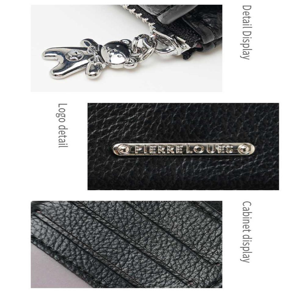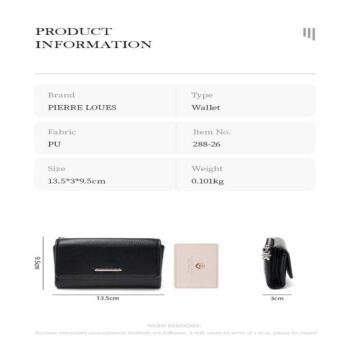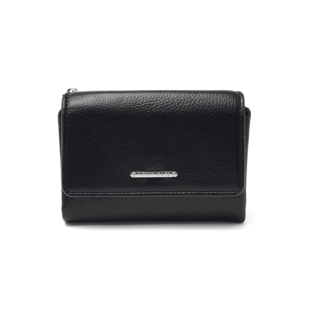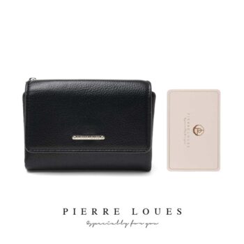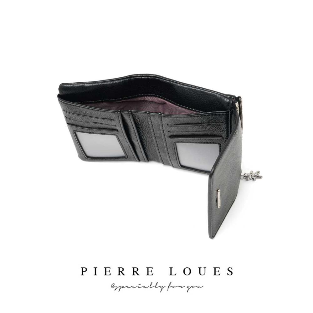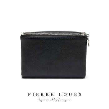 Μικρό πορτοφόλι γυναικείο Pierre Loues σε μαύρο χρώμα, με θήκες για κάρτες, χαρτονομίσματα και κέρματα. Ελαφρύ, πρακτικό και κομψό για καθημερινή χρήση.
