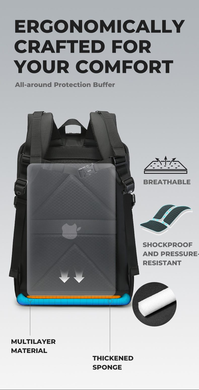 Η εργονομική πλάτη με αναπνεύσιμα υλικά και ενισχυμένο σφουγγάρι μειώνει την πίεση και προσφέρει άνεση ακόμη και σε πολύωρη χρήση. Οι πολλαπλές στρώσεις υλικού, μαζί με το shockproof σύστημα, προστατεύουν το laptop σας από κραδασμούς και πιέσεις. Επιπλέον, οι ενισχυμένοι ιμάντες ώμου προσαρμόζονται τέλεια στο σώμα, ενώ η πρακτική ταινία αποσκευής σας επιτρέπει να το προσαρμόσετε εύκολα στη βαλίτσα σας για ξεκούραστα ταξίδια.