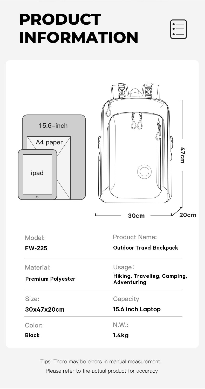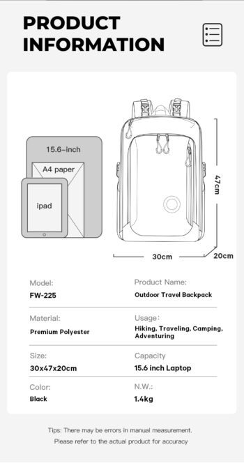 Το σακίδιο πλάτης σχεδιάστηκε για να καλύψει κάθε ανάγκη σας. Είναι κομψό για την καθημερινότητα και τη δουλειά, ανθεκτικό για ταξίδια και απόλυτα λειτουργικό για πεζοπορία ή εξορμήσεις στο βουνό. Κατασκευασμένο από premium αδιάβροχο πολυεστέρα, προστατεύει τον εξοπλισμό σας από τη βροχή και τη φθορά, ενώ το μινιμαλιστικό μαύρο design του προσδίδει στυλ σε κάθε εμφάνιση.