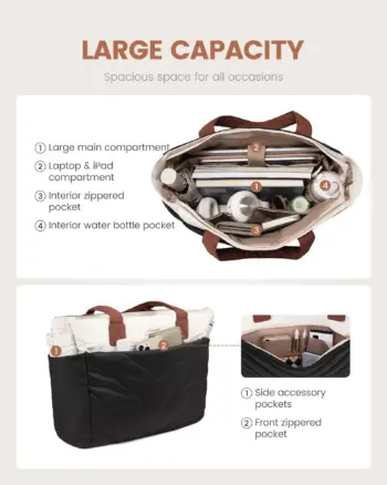 Η τσάντα διαθέτει ευρύχωρο κεντρικό διαμέρισμα που χωράει laptop έως 15.6 ιντσών, tablet, σημειωματάρια και έγγραφα. Εσωτερικά, υπάρχουν πολλαπλές θήκες για κινητό, power bank, καλλυντικά ή αξεσουάρ, καθώς και θήκη με φερμουάρ για ασφαλή αποθήκευση. Επιπλέον, δύο πλαϊνές θήκες επιτρέπουν να μεταφέρεις μπουκάλι νερού ή ομπρέλα, ενώ η μπροστινή τσέπη με φερμουάρ προσφέρει άμεση πρόσβαση σε συχνά χρησιμοποιούμενα αντικείμενα.