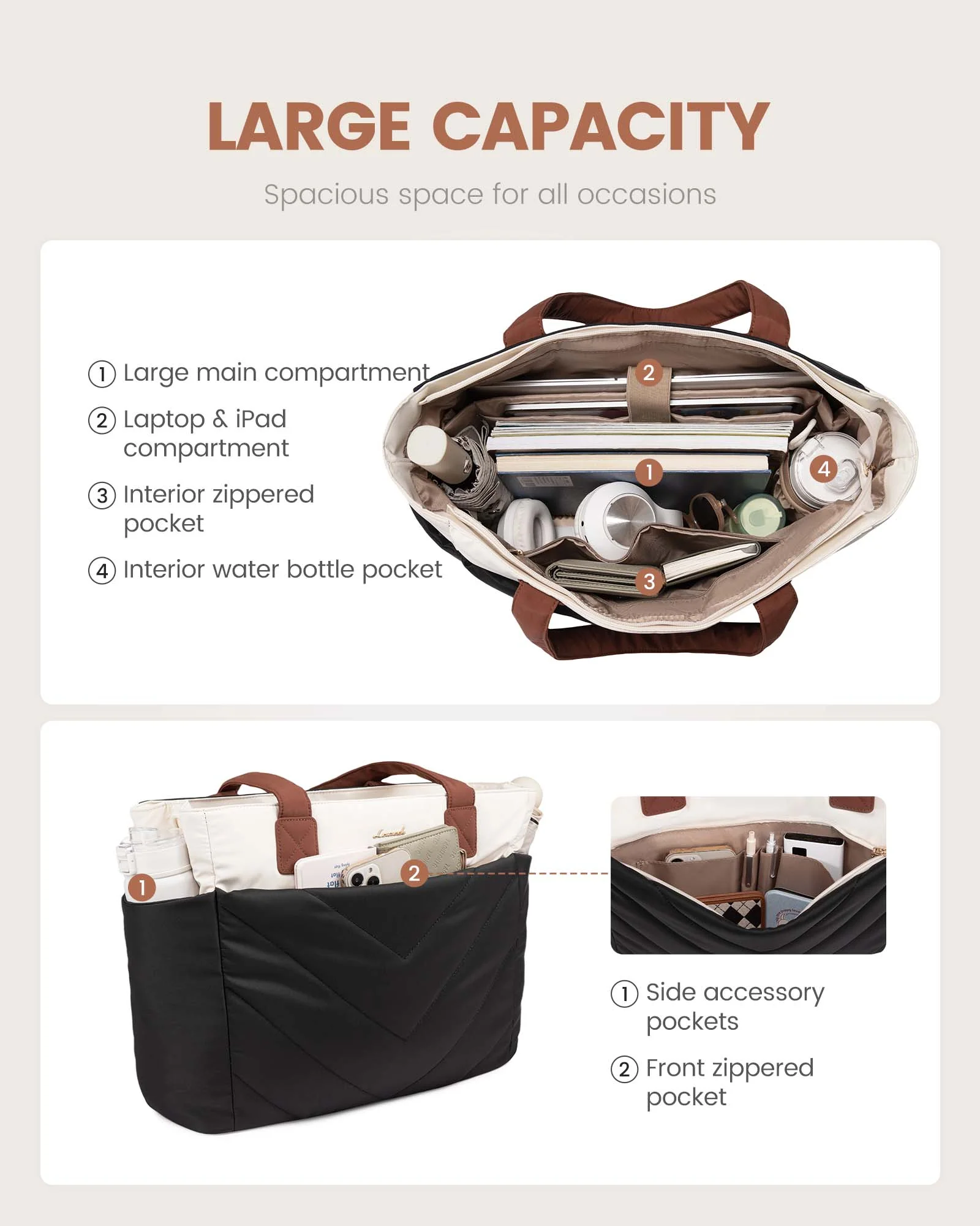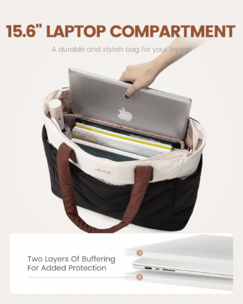 Η τσάντα laptop γυναικεία είναι εξαιρετικά ελαφριά — μόλις 0.45 κιλά. Κατασκευάζεται από μαλακό, ανθεκτικό ύφασμα που αντέχει στη χρήση και καθαρίζεται εύκολα. Οι λαβές της είναι ενισχυμένες για άνετη μεταφορά, ακόμα και όταν είναι πλήρως γεμάτη. Το λουράκι για βαλίτσα στο πίσω μέρος προσφέρει ευκολία στα ταξίδια, ενώ το φελλωτό εσωτερικό προστατεύει το laptop από κραδασμούς και χτυπήματα.